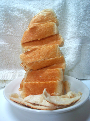 作中では「憎いあの女」だったかな?のパン屋さんの食パンにコロッケをのせてましたが、私はホームベーカリーで自作した食パンにのせようと思います。角型食パンが焼ける型で食パンを焼いたのですが、型から外す時に失敗して耳が剥がれて無残な姿に…(苦笑)。