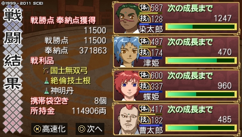 当代の弓使い蝶姫は、私が俺屍を最初にプレイした時の初代当主と同じ顔グラなので、どうしても国士無双弓をプレゼントしたかったのです。やったね!