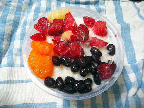 お味は、かなり甘いです。カキ氷も甘いし練乳も甘い。甘党の人には好評でしたが、甘~いクリームが苦手な私には「うーん…」でした(笑)。あと、上に乗ってる果物も当たり前ですが凍ってるので、うっかり噛むと言葉を失うほど冷たくて歯に染みます(笑)。