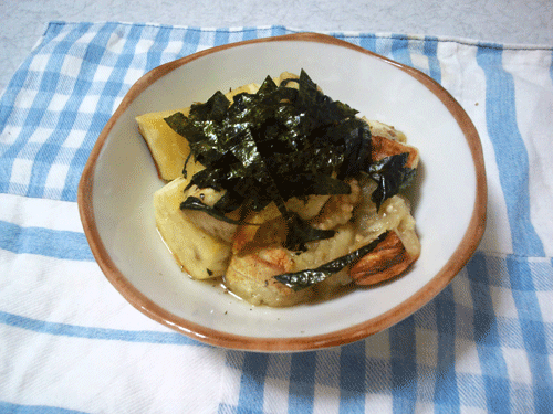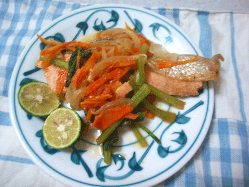 鮭、小松菜、人参(千切り)を軽くバターで焼いたあと、味噌と醤油と料理酒を混ぜた味噌ダレで味付けしています。こちらもさっぱりしておいしい。