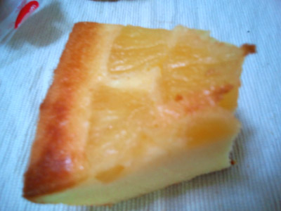 パウンドケーキみたいなものかな?と思っていたら、パウンドケーキよりフワフワの生地でした。シフォンケーキとパウンドケーキの間くらいの軽さ。味はとてもおいしいのですが、欲を言うならもっとパイナップル乗っけて欲しかったなぁ。ケーキの上の半分だけといわずにバーンとォ!ね(笑)。