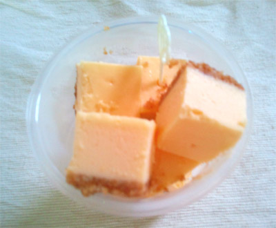 続きまして、えーと…チーズ…チーズフロマージュだったかな?蓋を取った後の写真しか残ってませんでした。ビスケット生地の上にチーズ生地を乗っけたチーズケーキを一口サイズにカットしたものでがカップに入っています。これで300円くらいだったかな。