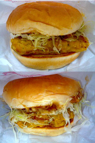 これは比較的最近、モスの「ツナバーガー」ですね。クーポン使って1個250円だったかな?醤油生姜味とブイヤベース味、両方買ってみました。挟まってる魚フライは、ツナというよりマグロというかカツオと言うか…メンチカツが挟まってると思っていたらトンカツが挟まってた、みたいな印象でした。味は普通に美味しかったです。すごく、フツー(笑)。